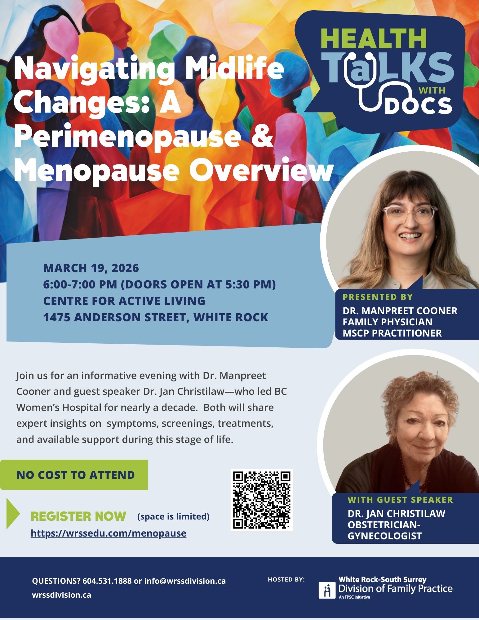 White Rock-South Surrey residents, join us for an informative evening with Dr. Manpreet Cooner and guest speaker Dr. Jan Christilaw—who led BC Women’s Hospital for nearly a decade and recipient of the Order of Canada. Both will share expert insights on symptoms, screenings, treatments, and available support during this stage of life.This free education session takes place from 6:00 to 7:00 pm (doors open at 5:30 pm) on March 19, 2026 at the Centre for Active Living, 1475 Anderson Street, White Rock.